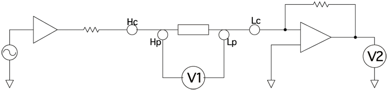 作為LCR測試儀的測量回路,較多采用的回路方式之一就是"自動平衡電橋法"。有Hc、Hp、Lp、Lc的4端子,并將所有端子連接被測物?;芈犯怕院透鞫俗拥墓δ苷垍⒖既缦聝热荨?/span> 通過檢測電阻將流過被測物的電流進行電壓轉換并檢測。讓Lc端子的電位保持為OV。