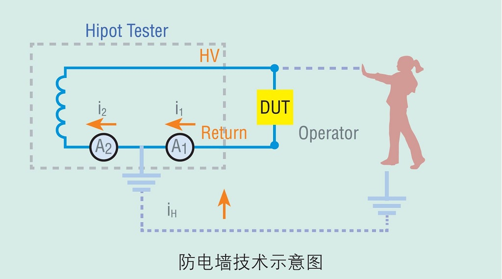常州致新ZX9501系列耐壓機(jī)具有GFI防電墻功能來(lái)保護(hù)測(cè)試人員(原理如圖所示)。在突發(fā)人體感電的情形下,GFI能立即切斷儀器的電壓輸出,保護(hù)操作員不受電氣傷害。GFI功能偵測(cè)從地端(Earth GND)流回的電流iH與低端電流iL,比較后若大于0.5mA,則會(huì)立即切斷高壓輸出。