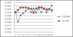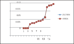 測試速度快了,還必須保證測量數(shù)據(jù)的穩(wěn)定性,左圖是兩種不同的機(jī)型,大家都用各自的最快測試速度,掃描測試同一個(gè)網(wǎng)絡(luò)變壓器同一個(gè)繞組的漏感15次的測量數(shù)據(jù)分布圖,我們可以看到,ZX2789的測量數(shù)據(jù)的一致性要略好一些。